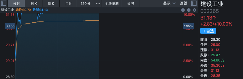 建筑工业开盘仅约2分钟就强势涨停,股价创3年多来新高,并贴近历史最高点,内蒙一机、光电股份等盘中也异动拉升。