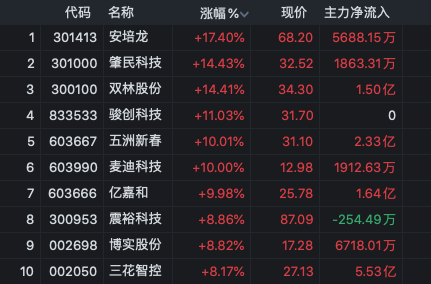 安培龙、肇民科技盘中均涉及20%涨停,麦迪科技流畅第3日涨停,五洲新春流畅2日封板,兆威机电在流畅2日涨停后,当天再度涉及涨停,股价创历史新高(复权,下同)。