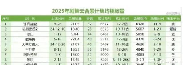 2025年快要尾声,电视剧的播放收成大势底定。字据云合数据统计,2025年电视剧集均播放量名次,赵露念念主演的皆会爱情剧《许我谛视》以6577万集均播放量夺冠,以些微距差跨越檀健次的推理剧《猎罪图鉴》第二季夺冠,堂堂登上剧王宝座。紧追在后的鉴别是赵今麦的刑侦剧《漂白》,肖战的古装权略剧《藏海传》以及王鹤棣的《大奉大更东谈主》则分居三、四、五名。前10名好意思满榜单请见文末图表。