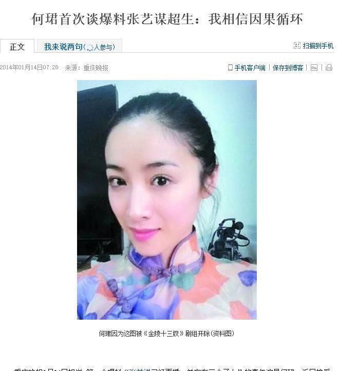 重庆晚报2014/01/14发布实践《何珺初度谈爆料张艺谋超生:我深信因果轮回》,
